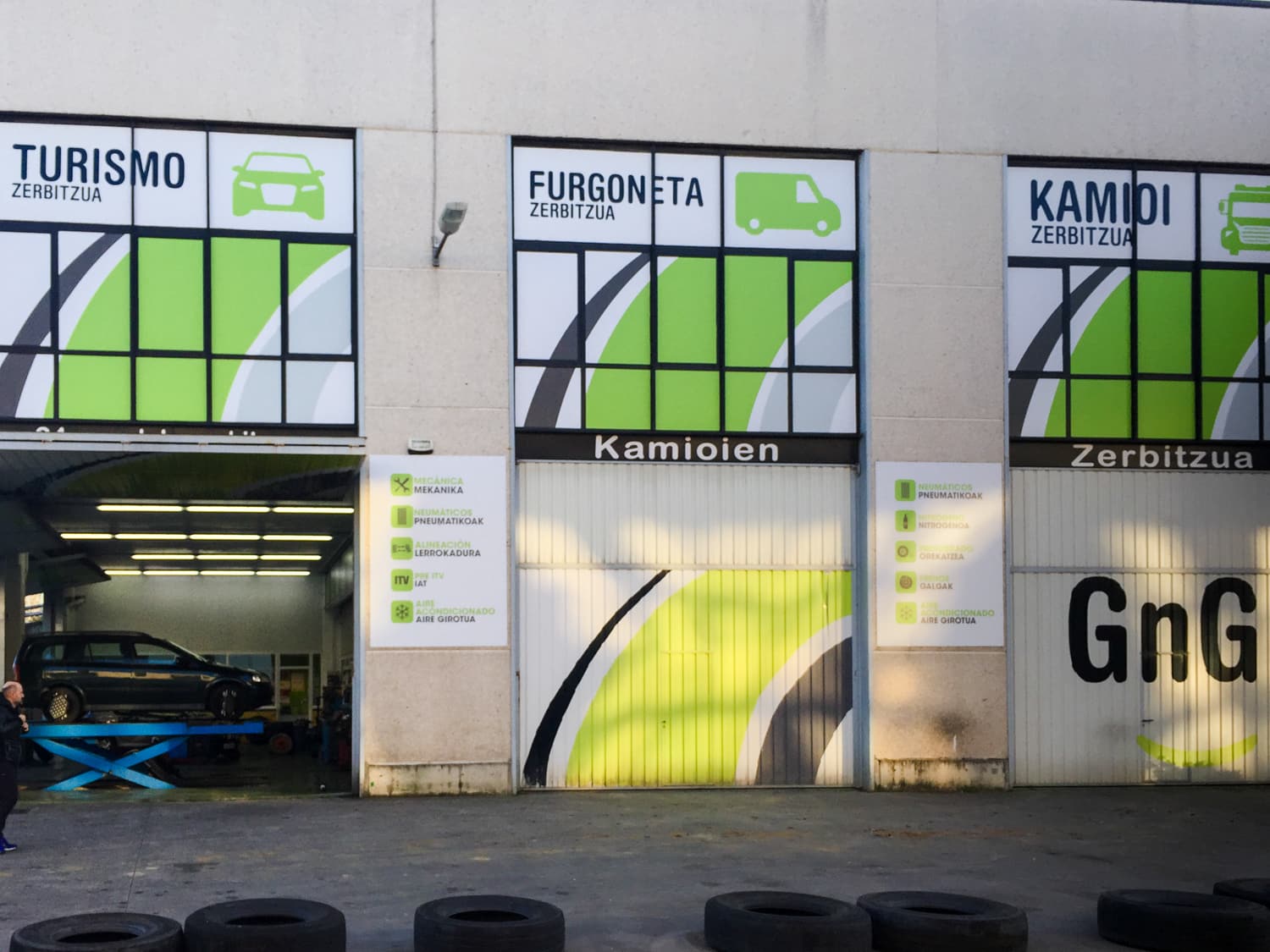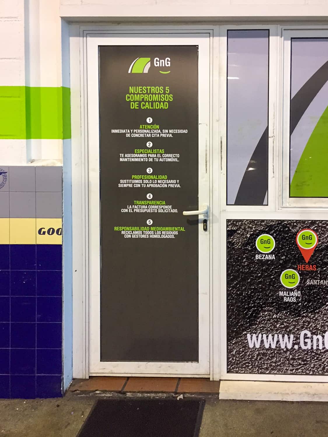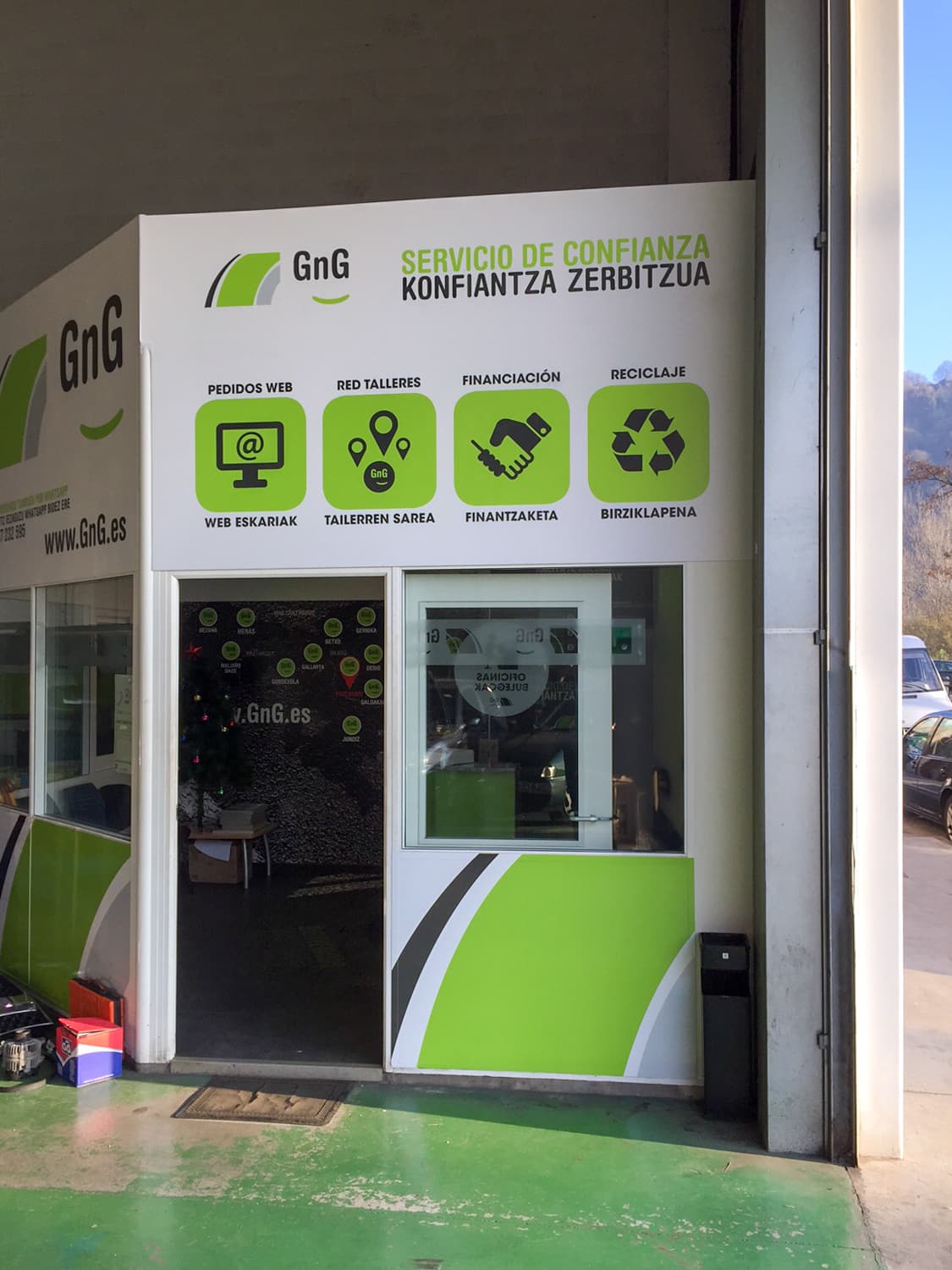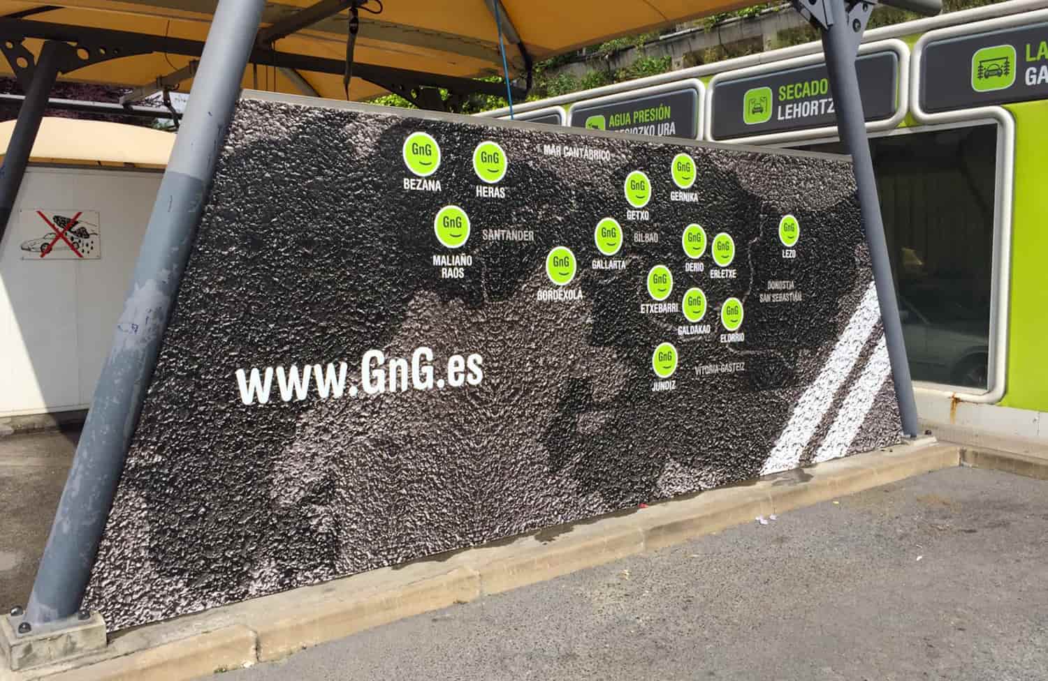 Con motivo de la decoración integral de varios talleres GNG en Vizcaya, en 254 Impresión nos encargamos de transformar cada espacio —interior y exterior— en un escaparate visual profesional acorde a la identidad de estos centros especializados en mantenimiento y reparación. Nos responsabilizamos del diseño, producción e instalación de vinilados interiores de gran formato que exhiben con claridad y estilo los servicios que ofrecen. Además, realizamos el vinilado exterior, incluyendo vinilos decorativos y cartelería impresa para puertas y ventanas, garantizando una comunicación visual coherente tanto dentro como fuera del taller. Nuestro servicio abarca desde el primer boceto hasta la colocación final, cuidando cada detalle para que cada taller refleje profesionalidad, calidad y una imagen atractiva alineada con la reputación de GNG como red líder en Euskadi y Cantabria.