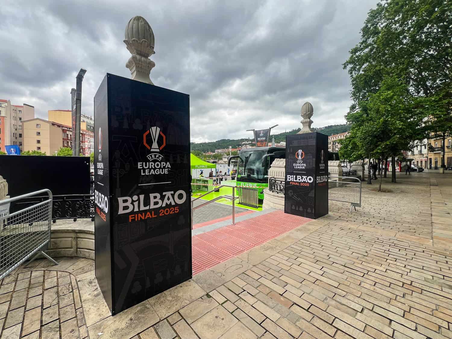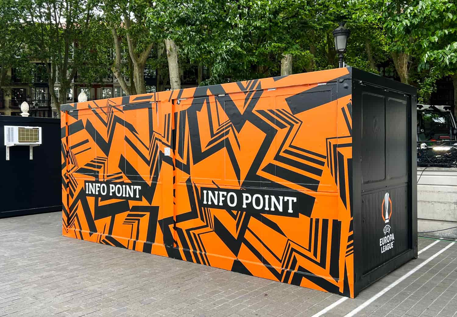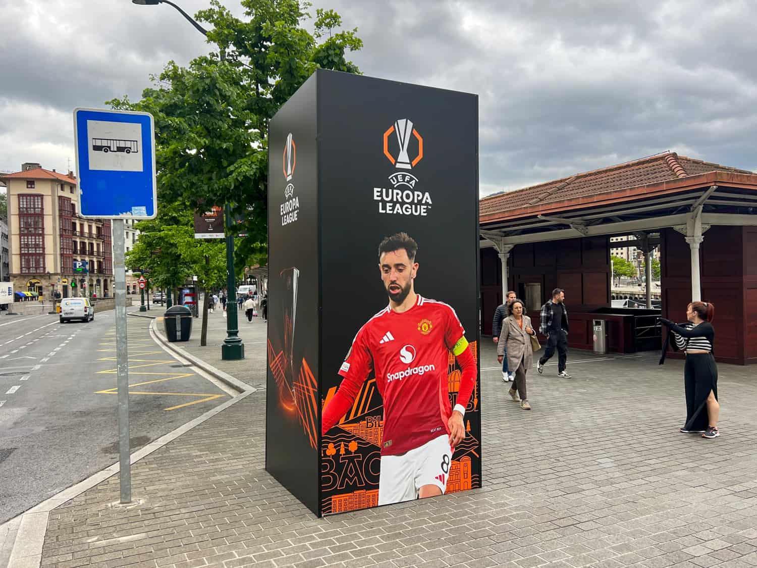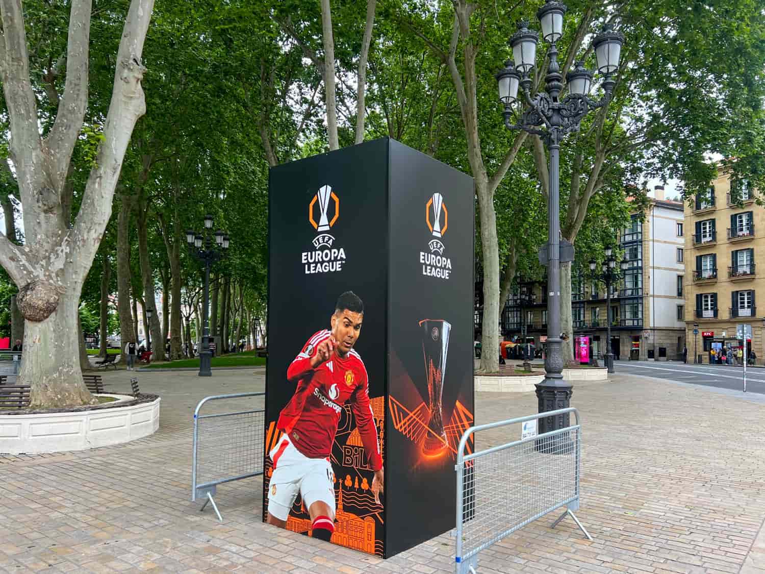 Con motivo de la celebración de la UEFA Europe League en Bilbao, tuvimos el reto de transformar la Plaza del Arenal en un espacio lleno de identidad y fuerza visual. Para ello, desarrollamos una producción gráfica de gran formato en la que combinamos creatividad, técnica y precisión. Diseñamos e instalamos tótems en Dibon, contenedores marítimos y blancos vinilados íntegramente con trasera opaca, vinilos de corte, escudos impresos sobre PVC de 5 mm y estructuras en PVC con soporte. Además, desplegamos un kilómetro de lona impresa con ojeteros que envolvió y unificó todo el espacio, creando un ambiente inmersivo y a la altura de un evento internacional de esta magnitud.